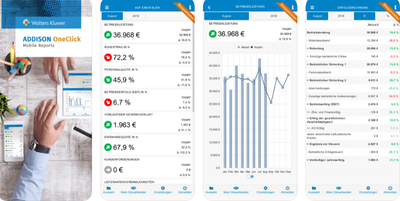 Mit Hilfe dieser App erscheint Ihre BWA in verständlicher Form und mit grafischer Aufbereitung direkt auf Ihrem Tablet oder Ihrem Smartphone. Die App verwendet den Zugang zu Ihrem ADDISON OneClick und setzt die dort bereitgestellten Daten in eine anschauliche und dynamisch bedienbare BWA um. Damit sind Sie immer schnell und mobil über die aktuellen Ergebnisse aus Ihrem Rechnungswesen informiert.