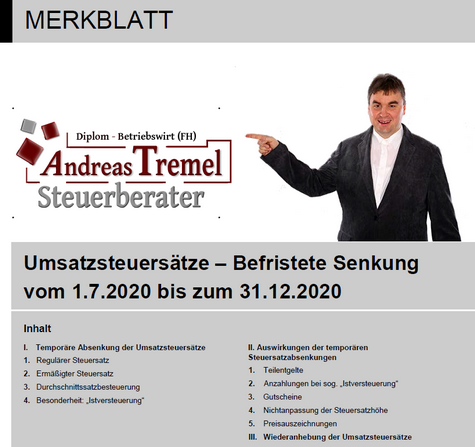 befristete Senkung der UmsatzsteuersätzeSteuernewsMerkblatt zur befristeten Senkung der UmsatzsteuersätzeAndreas Tremel | 6/9/2020Lesen