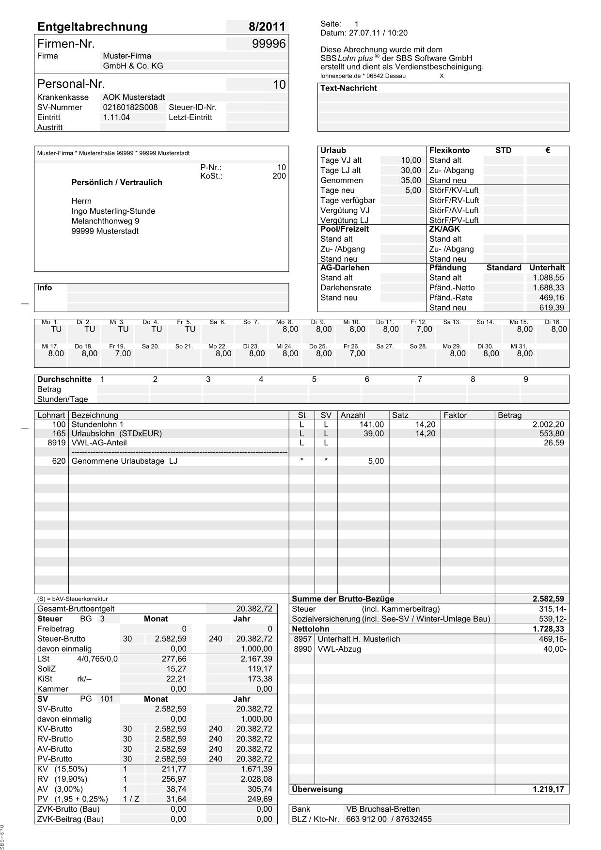 Anfertigung der Lohn- und Gehaltsabrechnungen (kuvertiert für die Arbeitnehmer und offen für den Arbeitgeber(hier ein Muster))